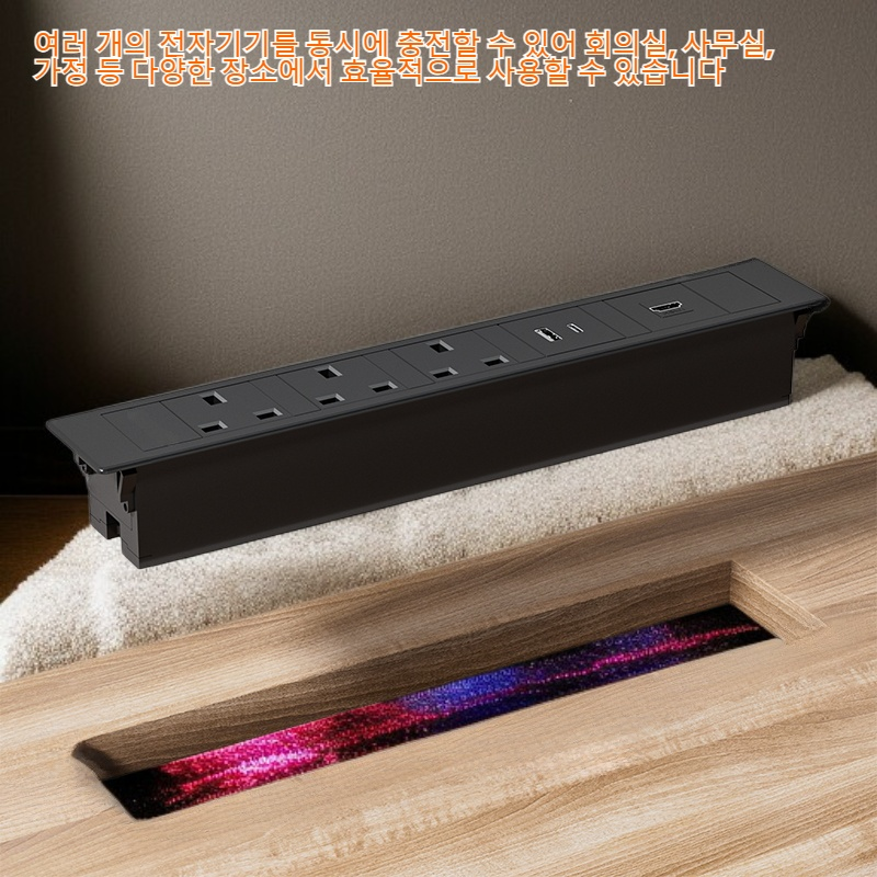 ● 테이블 위에 깔끔하게 설치되어 공간 활용도가 높고, 실내 인테리어에도 잘 어울리는 전원 콘센트입니다. ● 여러 개의 전자기기를 동시에 충전할 수 있어 회의실, 사무실, 가정 등 다양한 장소에서 효율적으로 사용할 수 있습니다. ● 안전한 설계와 과부하 방지 기능으로 전기 사용 시 걱정 없이 안심하고 사용할 수 있습니다. ● USB 포트가 내장되어 있어 스마트폰, 태블릿 등 다양한 디지털 기기를 별도의 어댑터 없이 바로 충전할 수 있습니다. ● 설치와 사용이 간편하여 누구나 손쉽게 사용할 수 있으며, 내구성이 뛰어나 오랜 기간 안정적으로 사용할 수 있습니다.